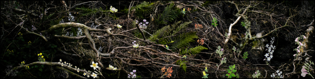 The image below is the work of two artists, Skirmantė Smažinienė and Martin. The photo was taken in Scotland (one of my grandmother’s favourite places) and represents her journey through the play of light on the branches and ferns, while the painted flowers are those native to each country my grandmother lived in and show the geographical journey she took through the course of her life.